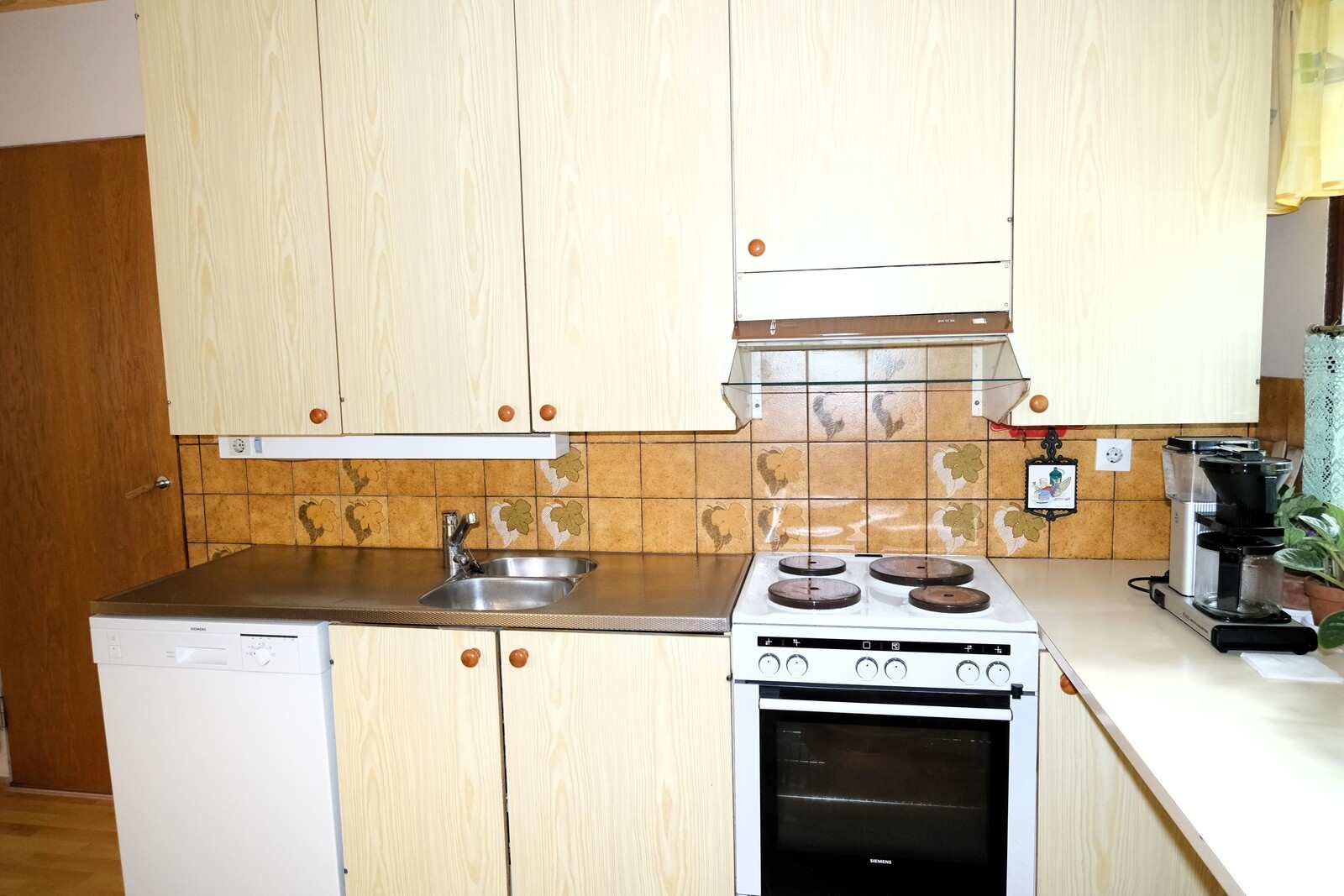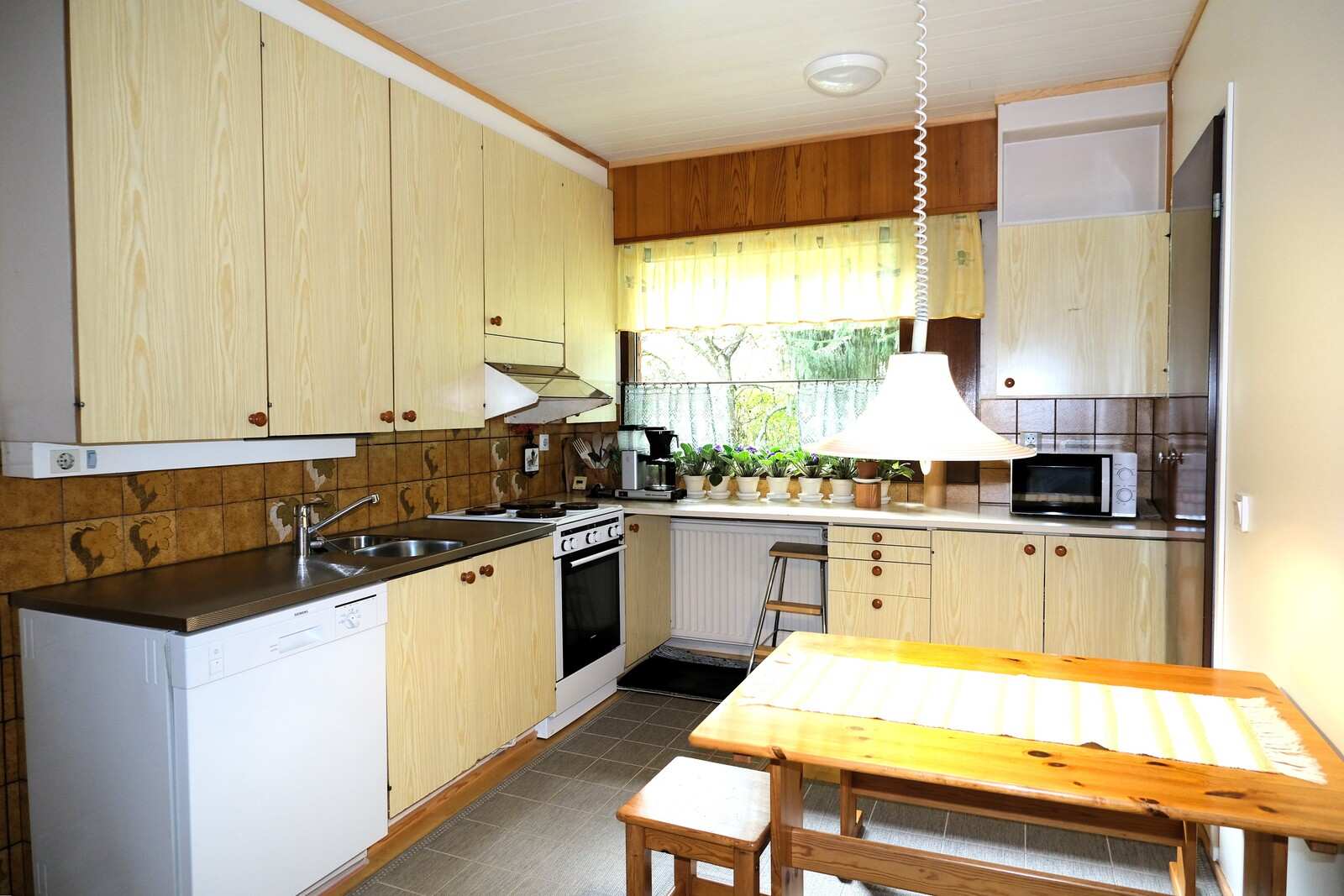 | Keittiön varustus | Jääkaappi ja pakastin: pakastin, kylmiö Seinät: maalattu Lattia: parketti Muut varusteet: astianpesukone, liesituuletin / hormi Liesi/uuni: sähköliesi |