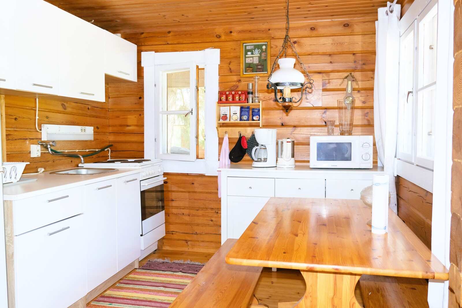 Keittiön varustus | Jääkaappi ja pakastin: jääkaappi Seinät: puu Lattia: lauta Liesi/uuni: sähköliesi |