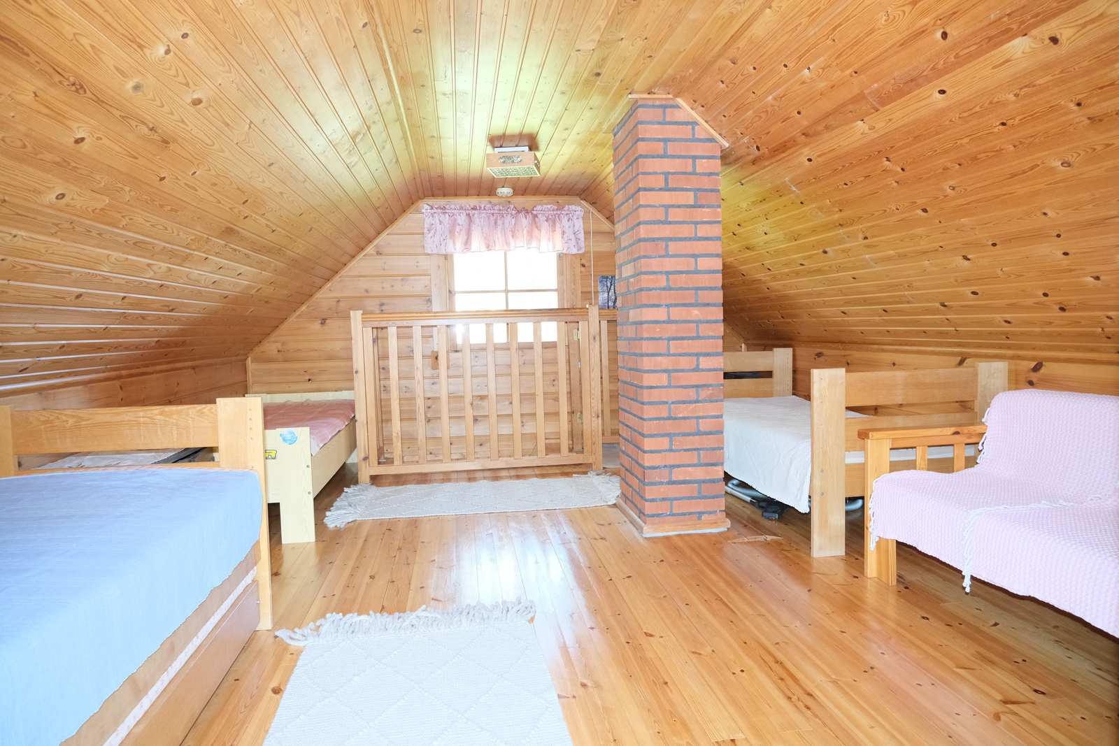 Tilojen kuvaus | Yläkerran parvelle saa nukkumatilat helposti kuudelle henkilölle, alakerran makuuhuoneessa sähgyt kahdelle |